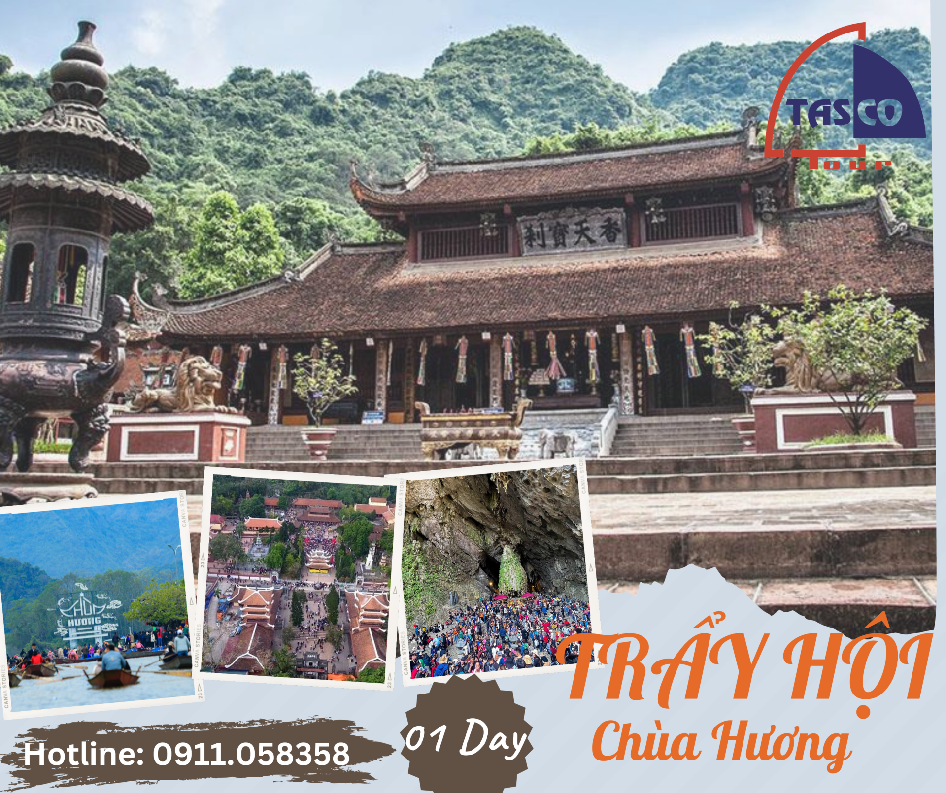 05h00: Xe ô tô đón Quý khách tại cơ sở đi đến Chùa Hương qua cổng Tiên Mai, Quý khách xuống đò vào Đền Trình làm lễ, tiếp tục hành trình đoàn xuôi dòng suối Yến vào thăm chùa Thiên Trù – Bếp Trời (Công trình kiến trúc được xây dựng vào thế kỷ XVII ).