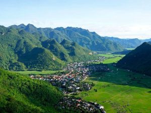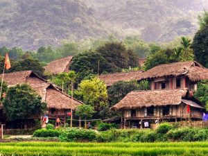 12h15’: Tiếp tục hành trình, xe đưa quý khách đi tham quan Bản Lác – Mai Châu. Vượt qua các con dốc cao, đến Đèo Thung Nhuối từ trên cao đoàn thấy Thung lũng Vàng. Huyện lỵ Mai Châu xinh đẹp hiện ra dưới tầm mắt, một thung lũng với màu xanh của ruộng đồng, những nếp nhà nhỏ li ti, ngắm toàn cảnh một thị trấn xinh xắn. đoàn tìm hiểu về phong tục tập quán của người Thái. Tiếp tục khám phá vẻ đẹp của Thung Lũng Mai Châu, bản Pom Coọng mua sắm quà lưu niệm.